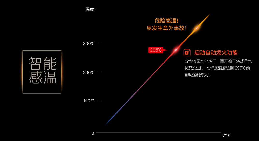 當(dāng)食物因水分燒干,而開始干燒或異常狀況發(fā)生時(shí),在鍋底溫度達(dá)到295℃前,自動(dòng)強(qiáng)制熄火。