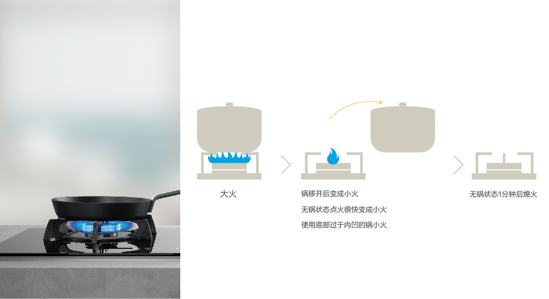 移鍋后,火力自動(dòng)調(diào)節(jié)成小火 放回后,火力自動(dòng)調(diào)節(jié)到移鍋前的狀態(tài)。如移鍋1分鐘后鍋仍未放置則自動(dòng)熄火,防止忘記關(guān)火。 如未檢測到鍋具的情況下,則無法點(diǎn)火。