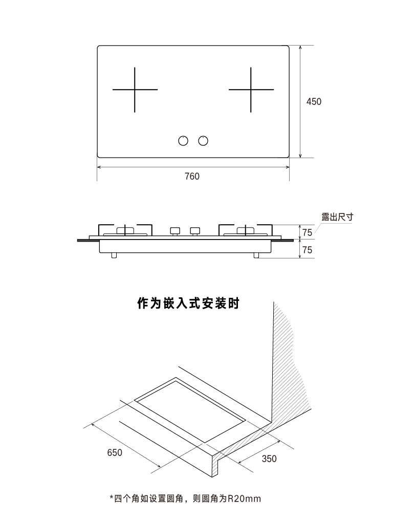 嵌裝開孔尺寸(mm) : (K4)(W)650×(D)350×R20